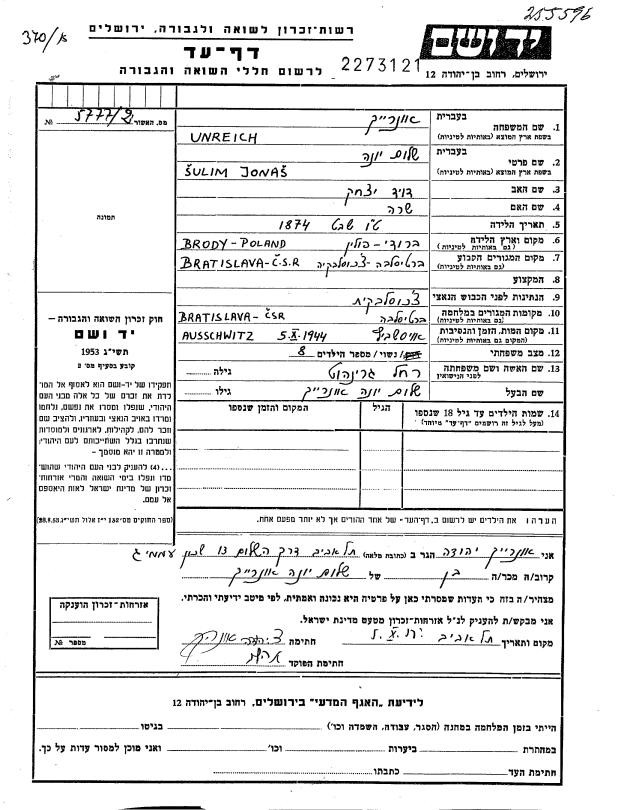Shulem Yonah Unreich, age 70. Location: Bratislava, Slovakia. Murdered in Auschwitz.